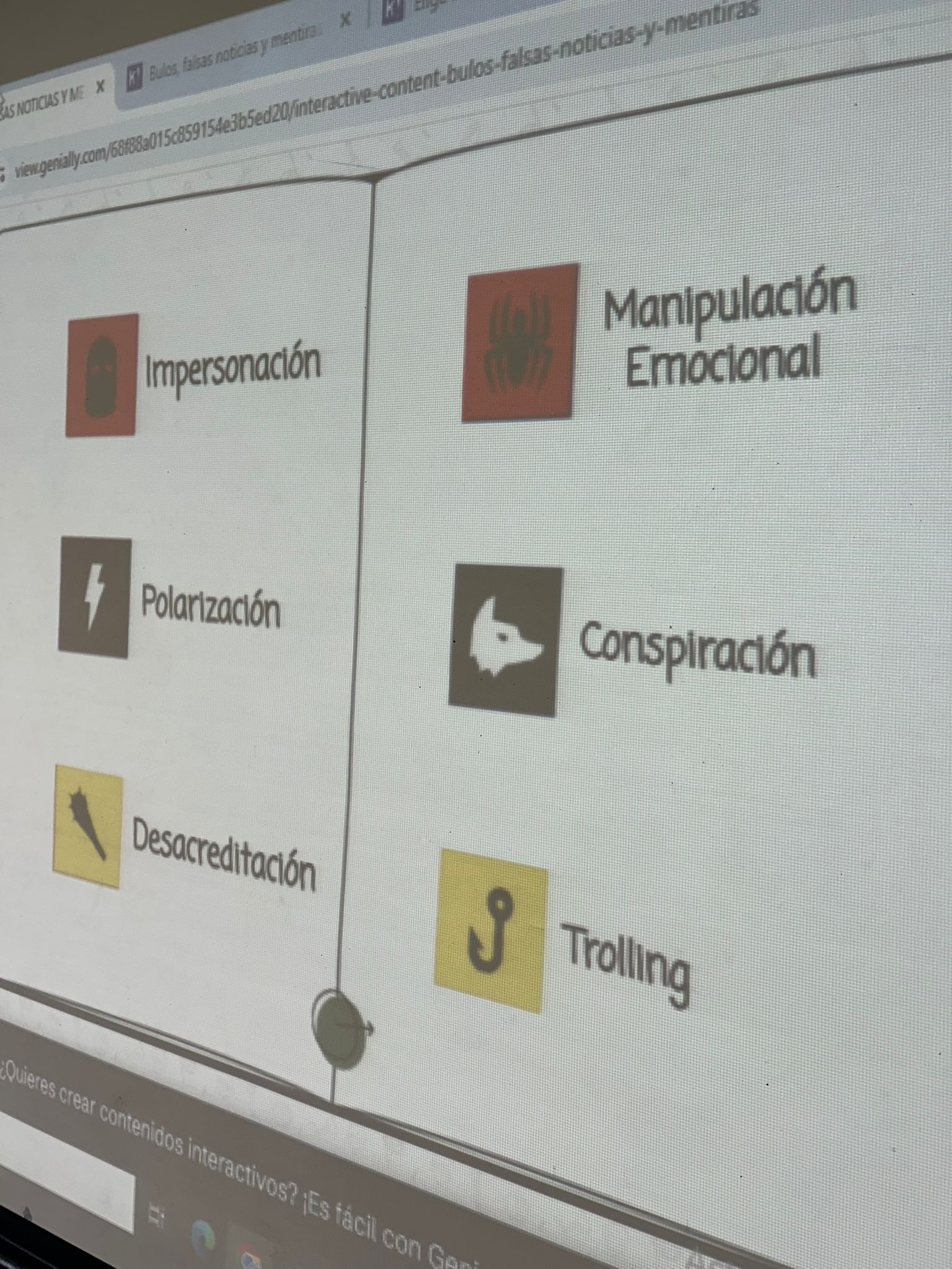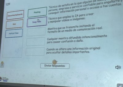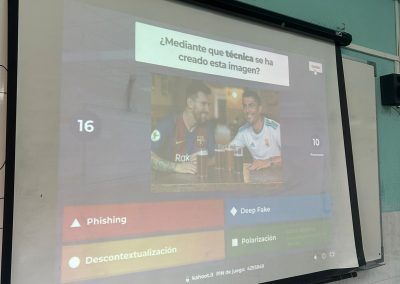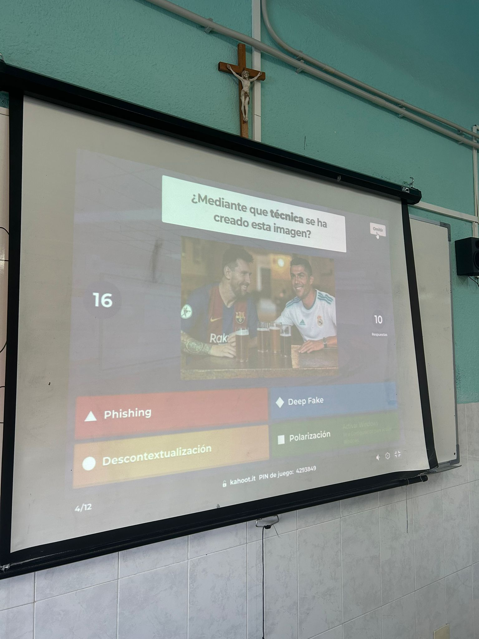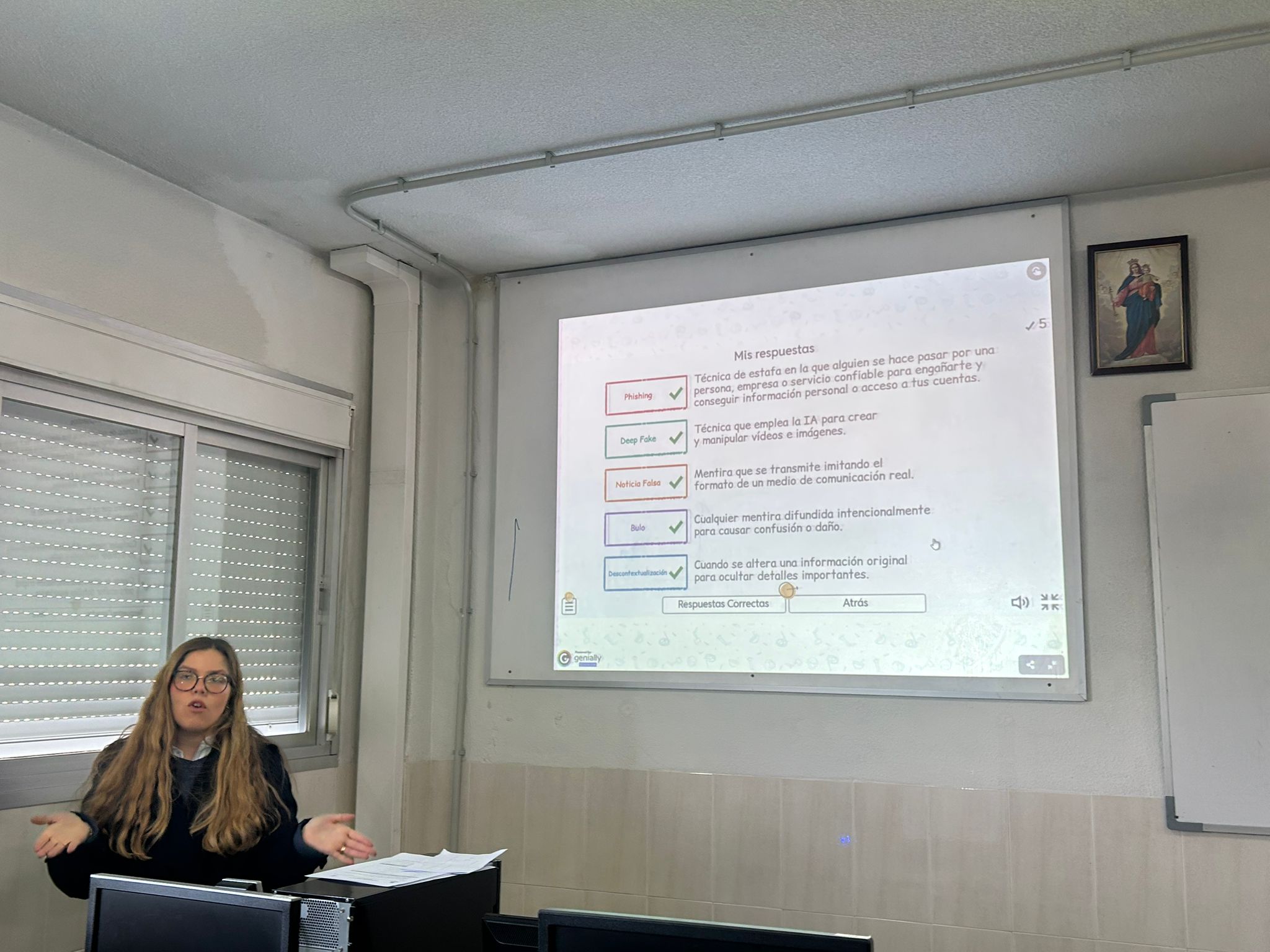 Durante la sesión, el alumnado ha trabajado conceptos fundamentales como el phishing, una técnica de engaño destinada a obtener datos personales; la diferencia entre bulo y noticia falsa, dos términos que a menudo se confunden; y los deepfakes, contenidos manipulados mediante inteligencia artificial que pueden alterar imágenes, audios o vídeos con un alto grado de realismo. Todos estos fenómenos, cada vez más presentes en el entorno digital, están directamente relacionados con la competencia comunicativa, la alfabetización mediática y el pensamiento crítico, pilares esenciales de la educación actual.