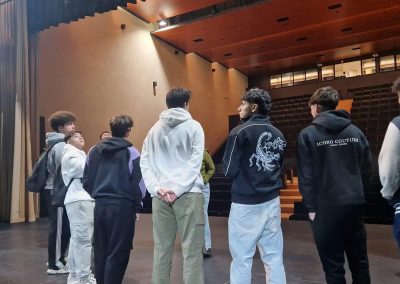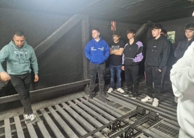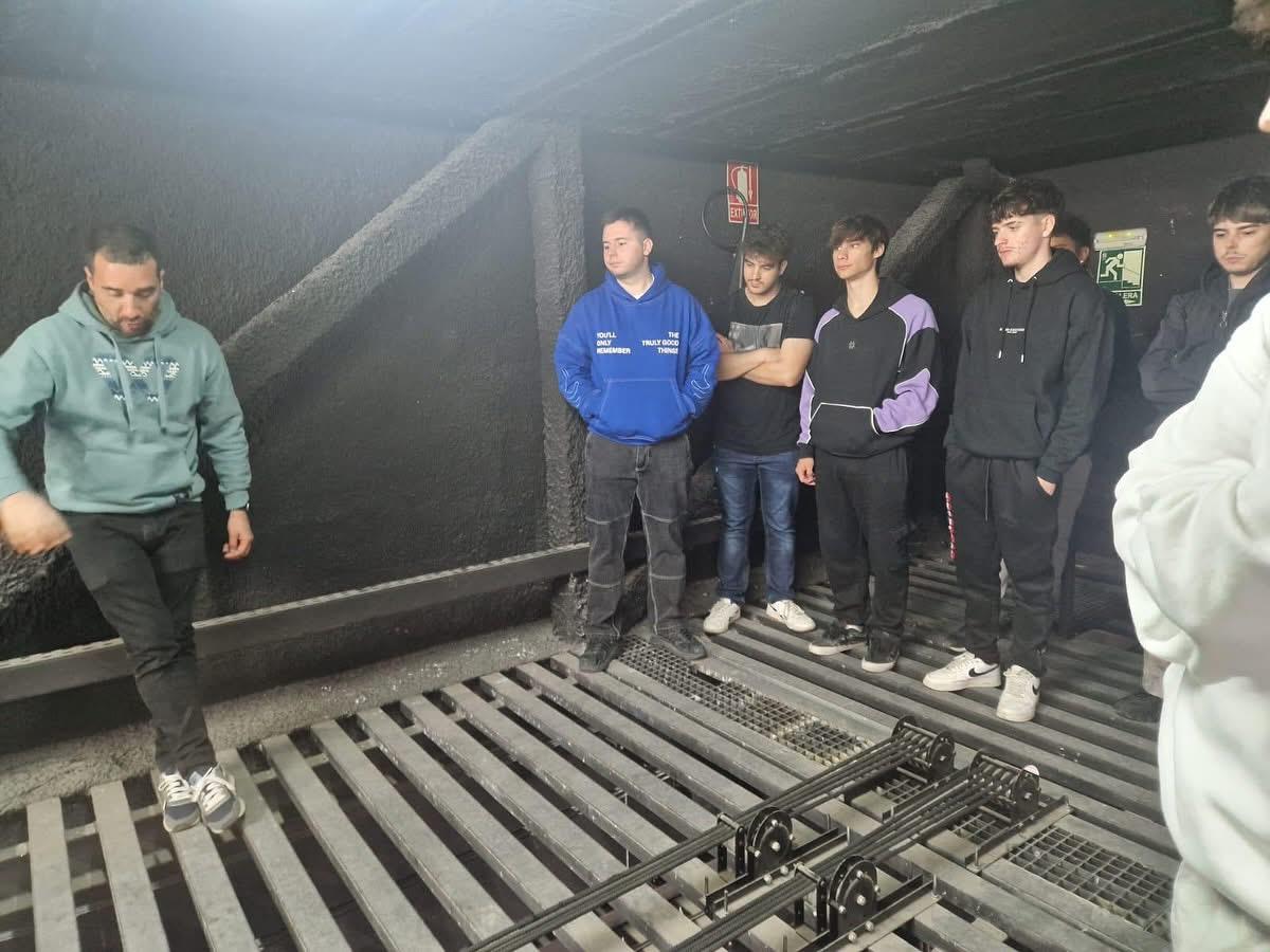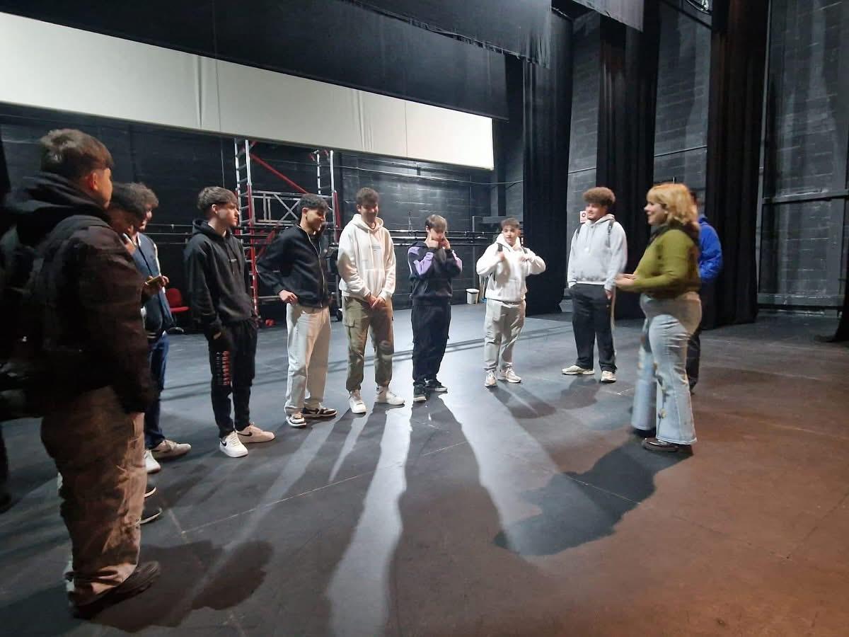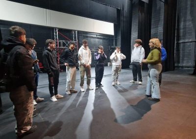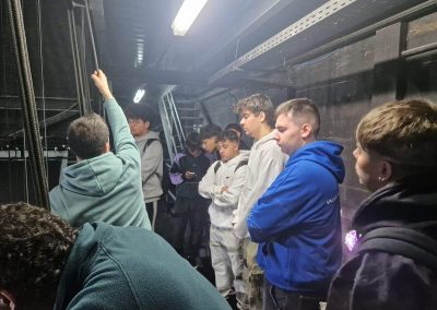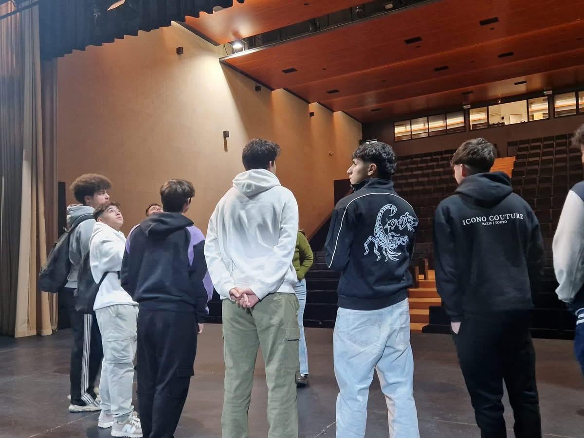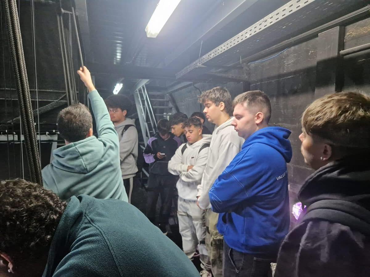 Durante la visita, los estudiantes recorrieron los distintos espacios del teatro, desde el foso donde se ubica el vestuario, pasando por la sala y la cabina de control, hasta llegar al peine, parte esencial de la estructura técnica del escenario. A lo largo del recorrido, el alumnado pudo observar el equipamiento técnico, los sistemas de iluminación y sonido, y la coordinación necesaria entre los distintos departamentos para garantizar el éxito de una representación en directo.